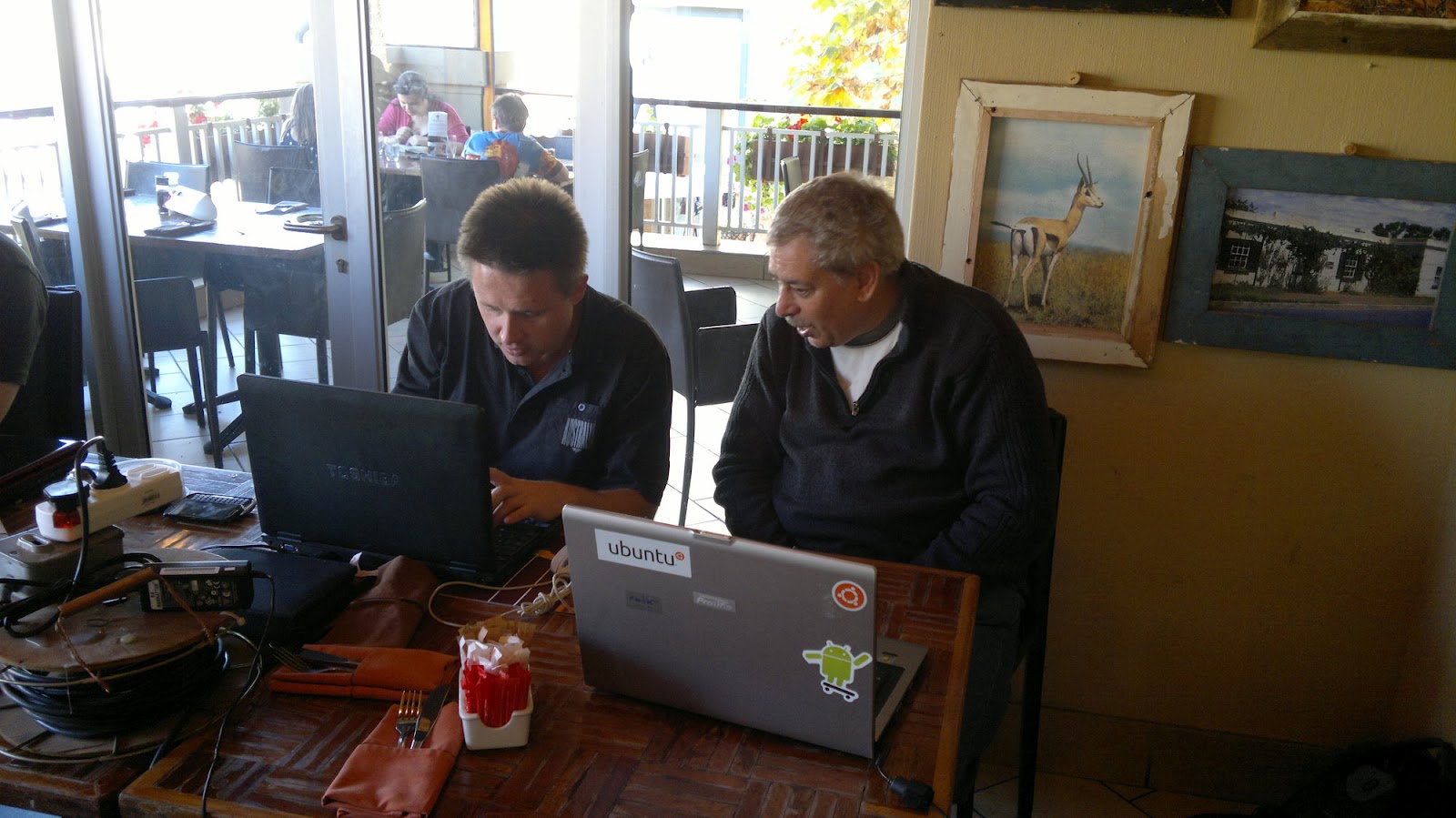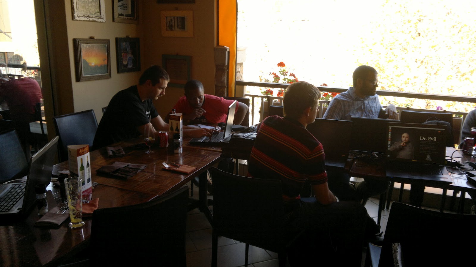 I wasn't there but it looks like fun. Lots of laptops in a restaurant. Thanks to Nic and Marius for making this happen and also Queery for the photos.